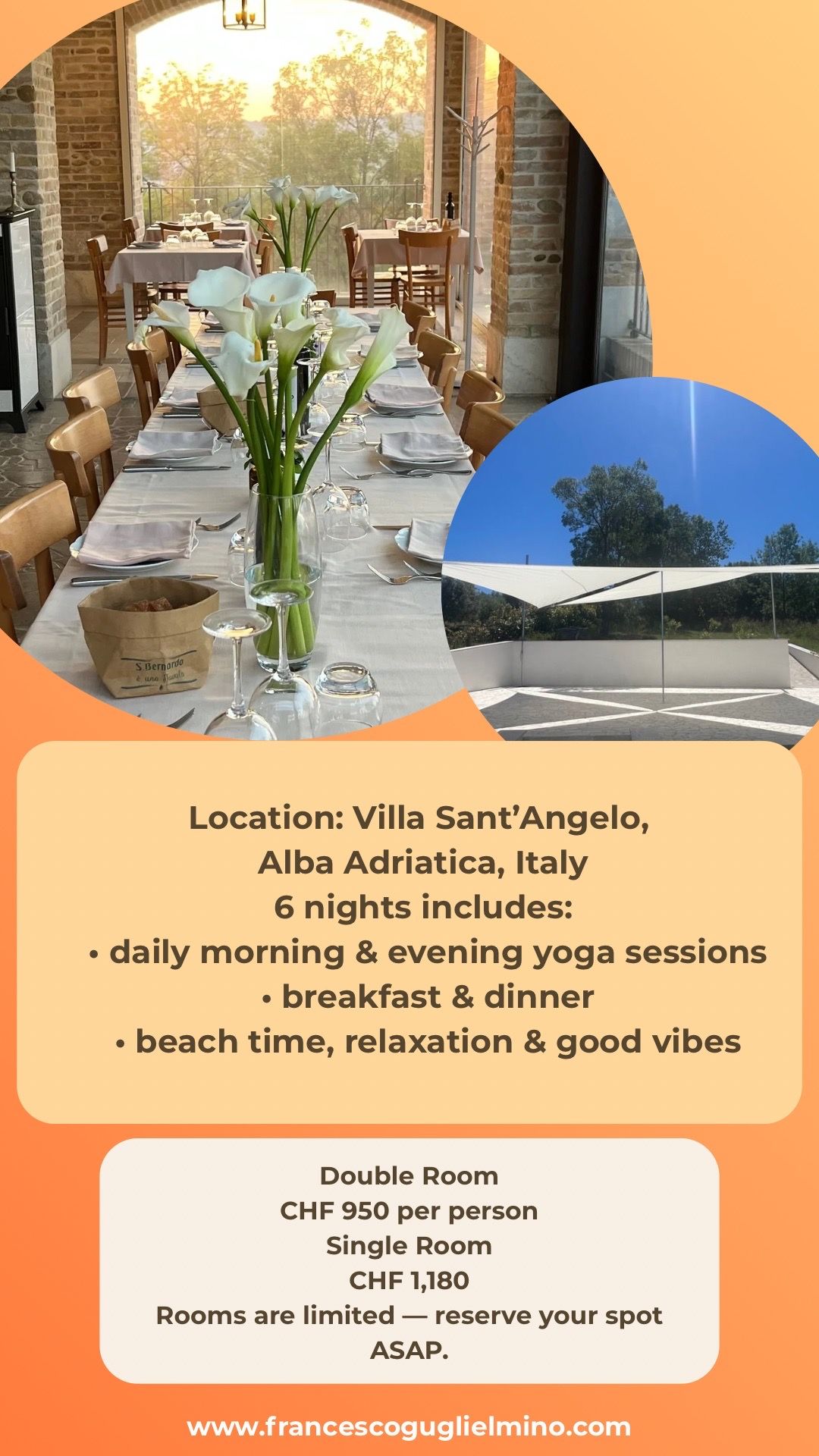 Join Yoga Teacher Francesco Guglielmino and host Françoise Pierantozzi in Alba Adriatica, Abruzzo, Italy, renowned for its breathtaking sunrises.